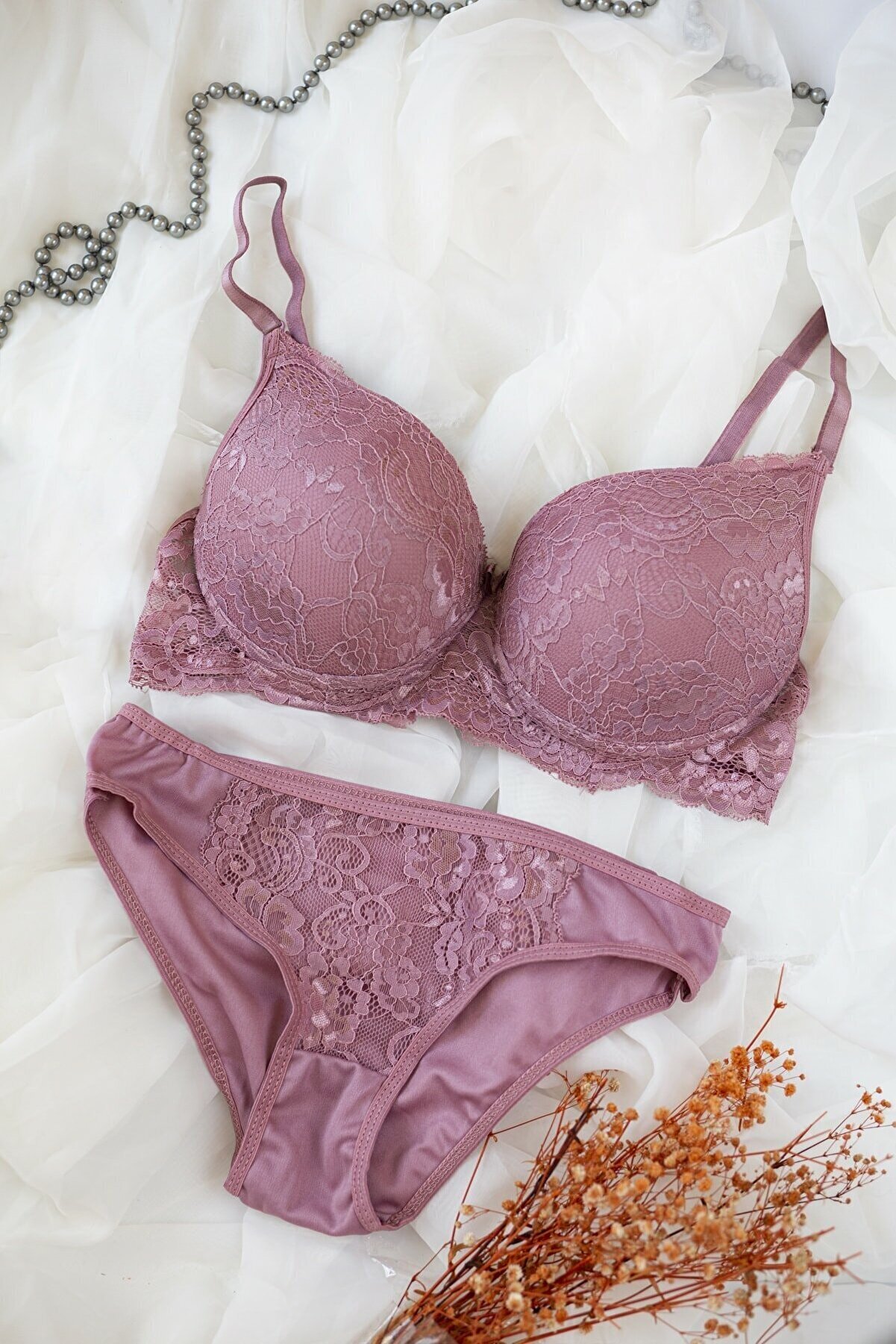 Kadın Mor Straplez Push Up Dolgulu Sütyen Külot Takımı – Modern, Konforlu ve Günlük Kombinlere Uygun
