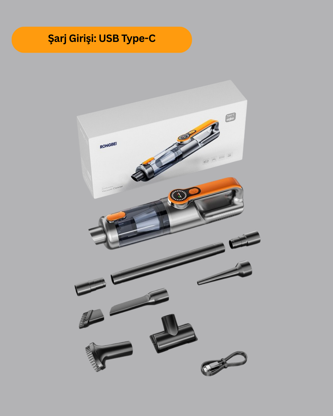 USB Type-C hızlı şarj özelliği ile kısa sürede şarj olur ve 25–30 dakika boyunca kesintisiz çalışabilir. Kablosuz yapısı sayesinde dar alanlarda ve araç içinde kullanım kolaylığı sağlar.