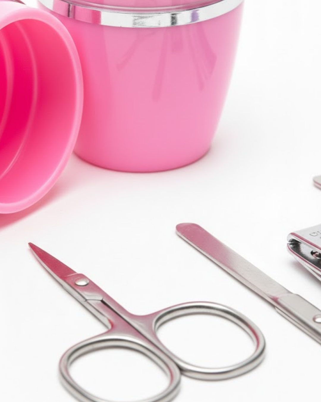 Set içeriğinde bulunan tırnak makası, manikür pedikür makası, cımbız ve törpü; günlük bakım ihtiyaçlarını eksiksiz şekilde karşılar. Metal yüzeyler sağlam yapısıyla dikkat çekerken, pembe detaylar ürüne estetik bir hava katar.