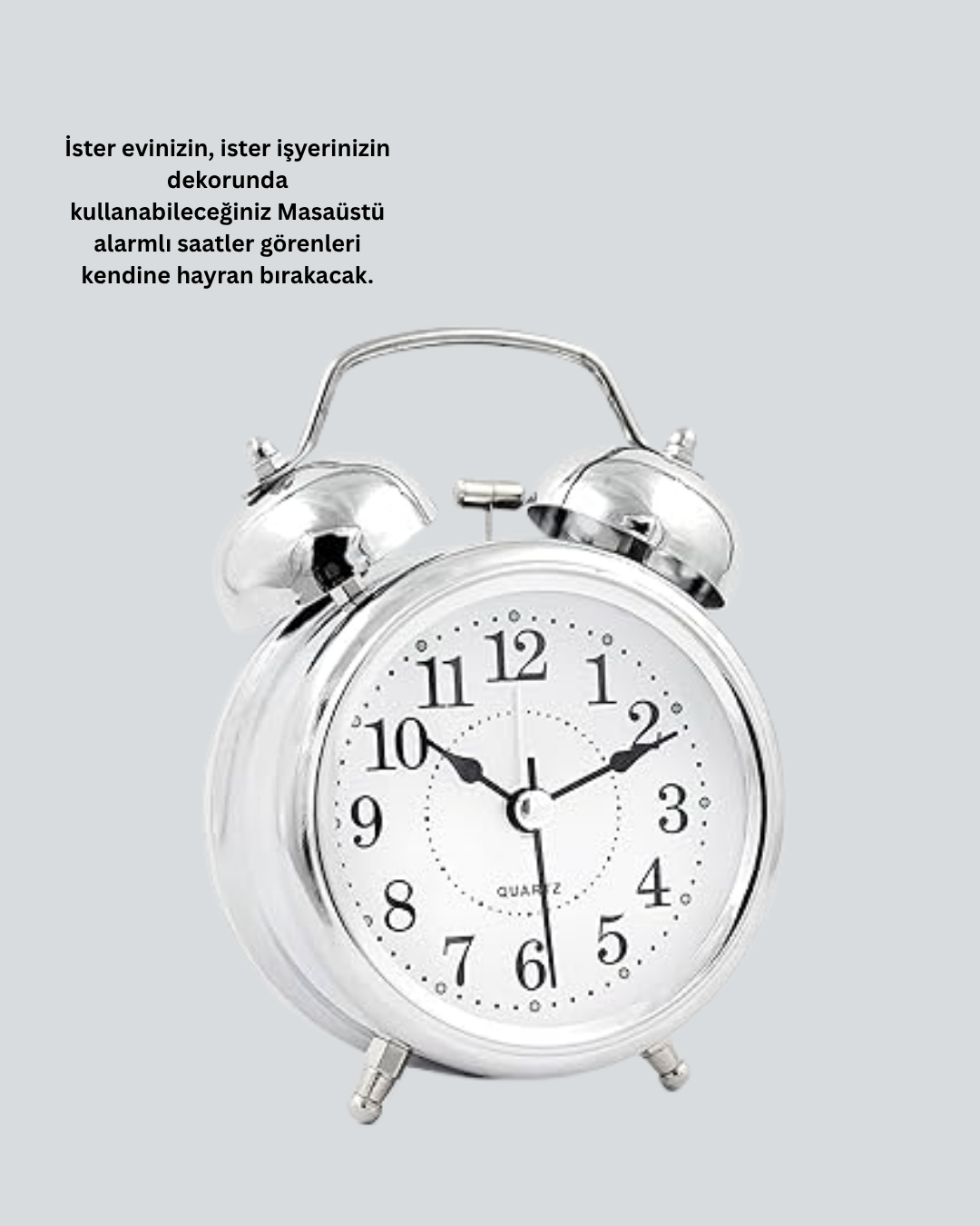 Alarmlı Dekoratif Yuvarlak Masa Saati Gümüş Renk Sessiz ve Işıklı