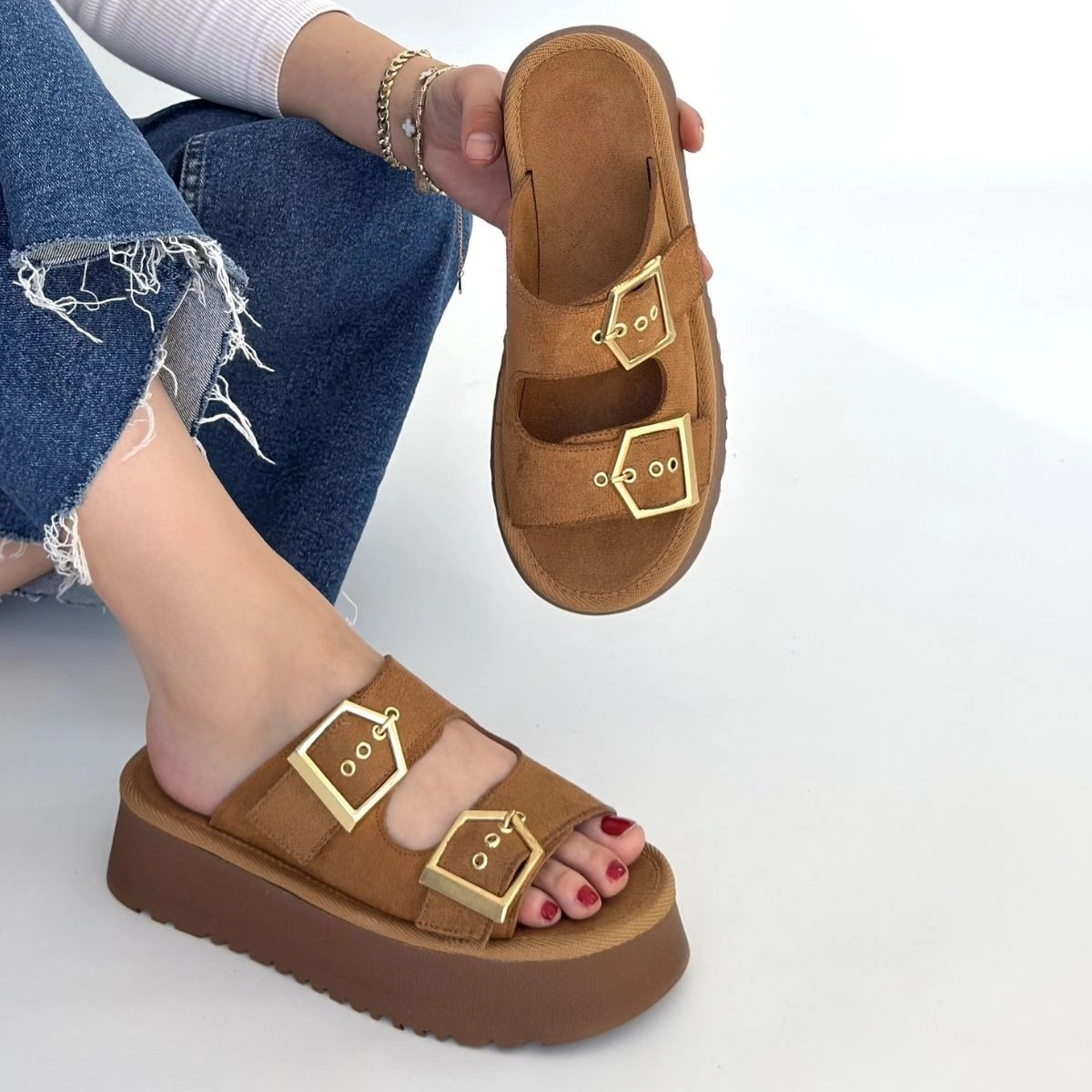 Coer Taba Süet Çift Tokalı Terlik