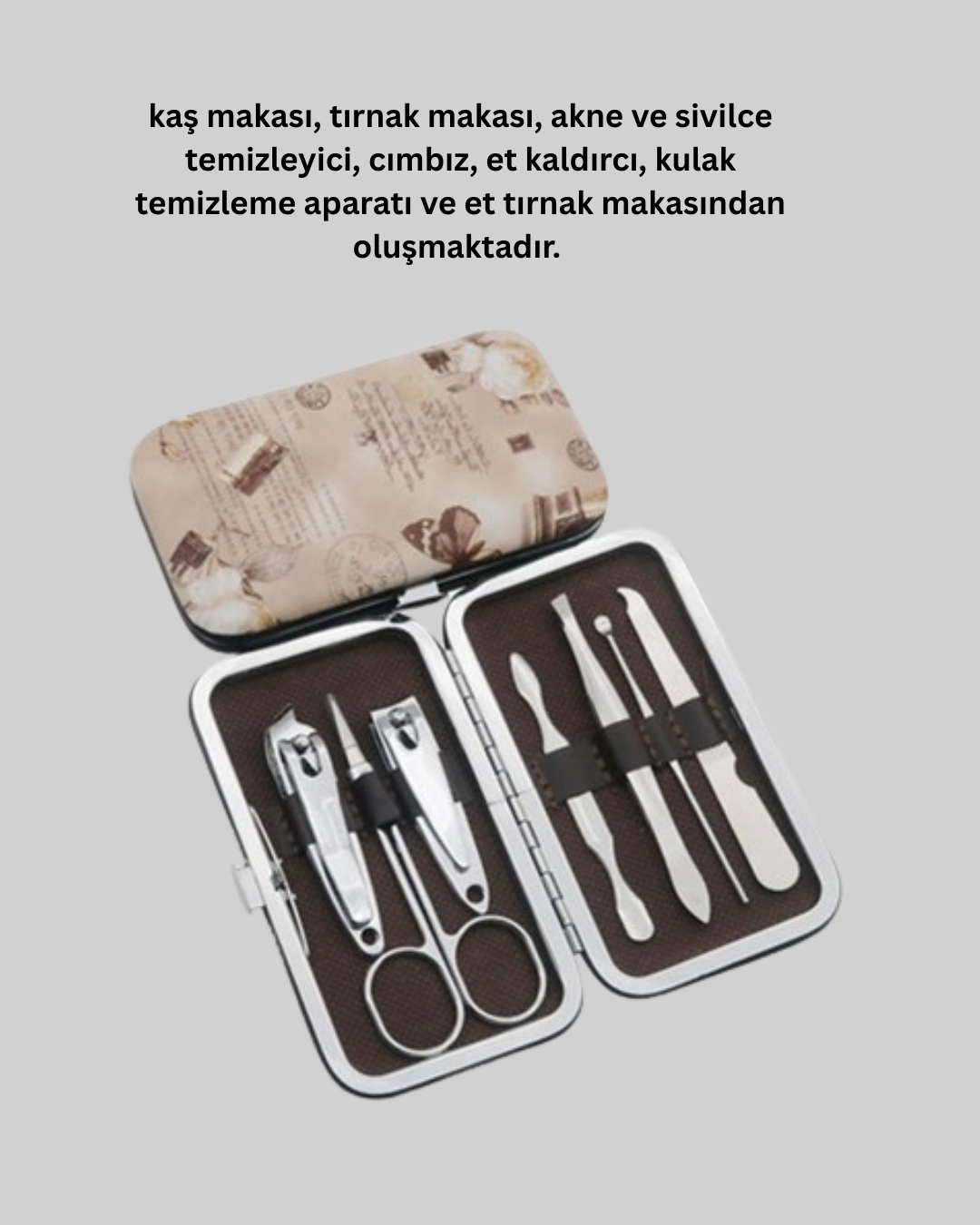 Kompakt tasarımı ve çok yönlü kullanımıyla bu kişisel bakım seti, hem kadınlar hem erkekler için ideal bir üründür. İçeriğinde bulunan tırnak makası, kaş makası, cımbız, kulak temizleme aparatı, et tırnak makası, et kaldırıcı ve sivilce temizleyici aparatlar sayesinde kişisel bakımınızı eksiksiz şekilde tamamlayabilirsiniz. Paslanmaz çelikten üretilmiş olan parçalar sağlamlığıyla uzun yıllar kullanım sunar. Şık çantası, hem düzenli saklama hem de kolay taşıma imkanı sağlar. Küçük boyutları sayesinde çantanızda fazla yer kaplamaz ve her yerde kullanım kolaylığı sağlar. Günlük kişisel bakımını önemseyen herkes için kaliteli ve pratik bir tercihtir.