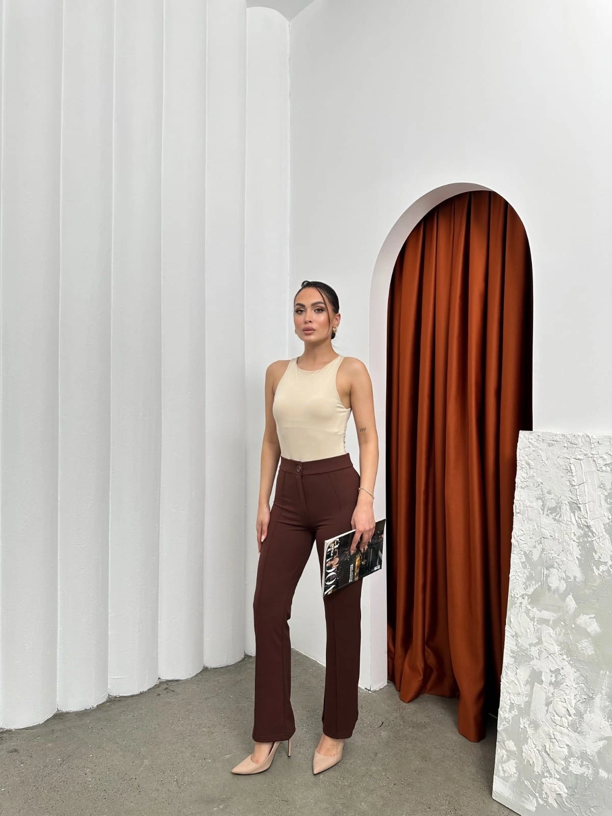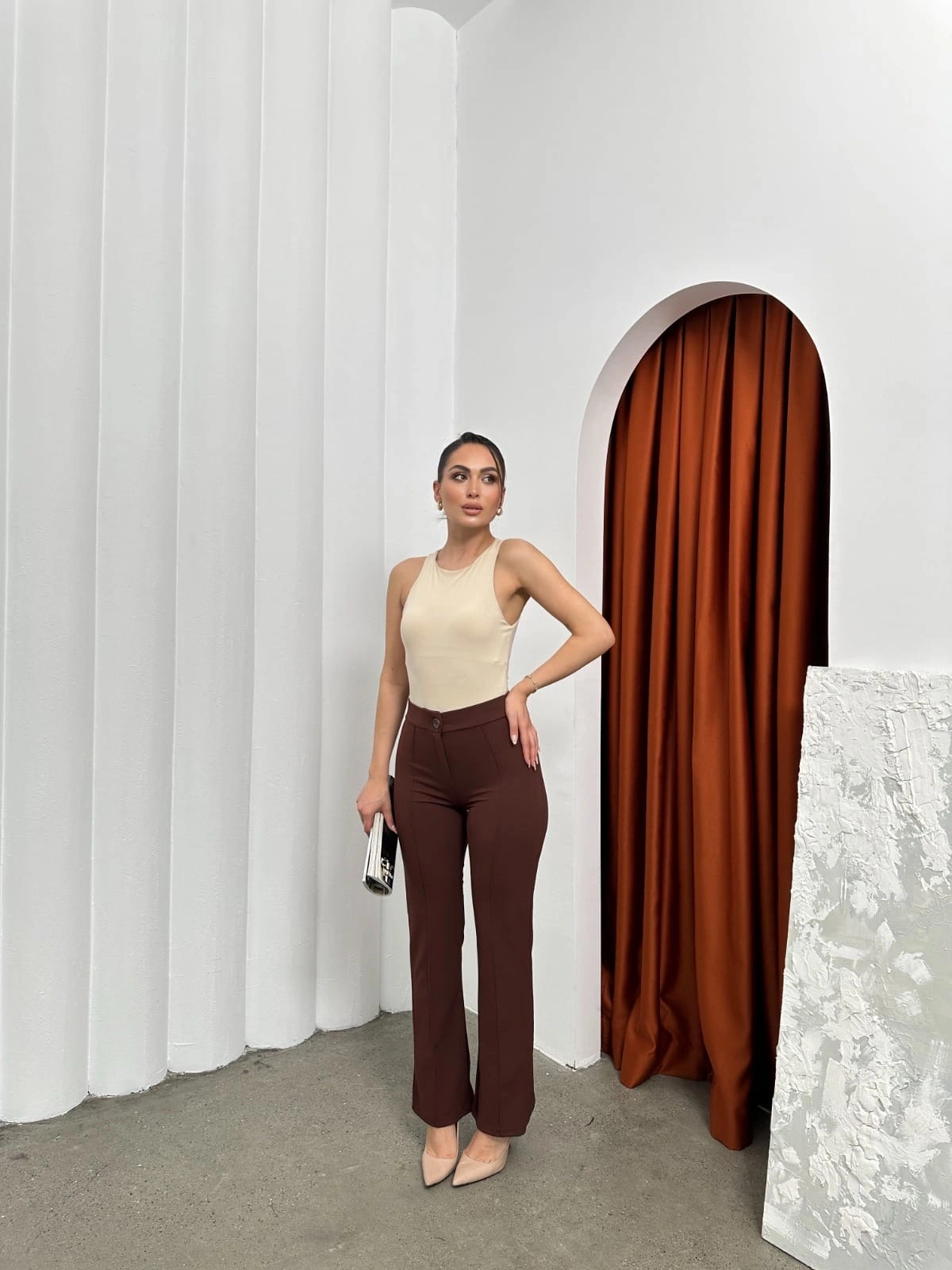 şık ve rahat tasarımıyla öne çıkan Düğmeli Palazzo pantolon kahve p170091, gardırobunuzun vazgeçilmezi olmaya aday!