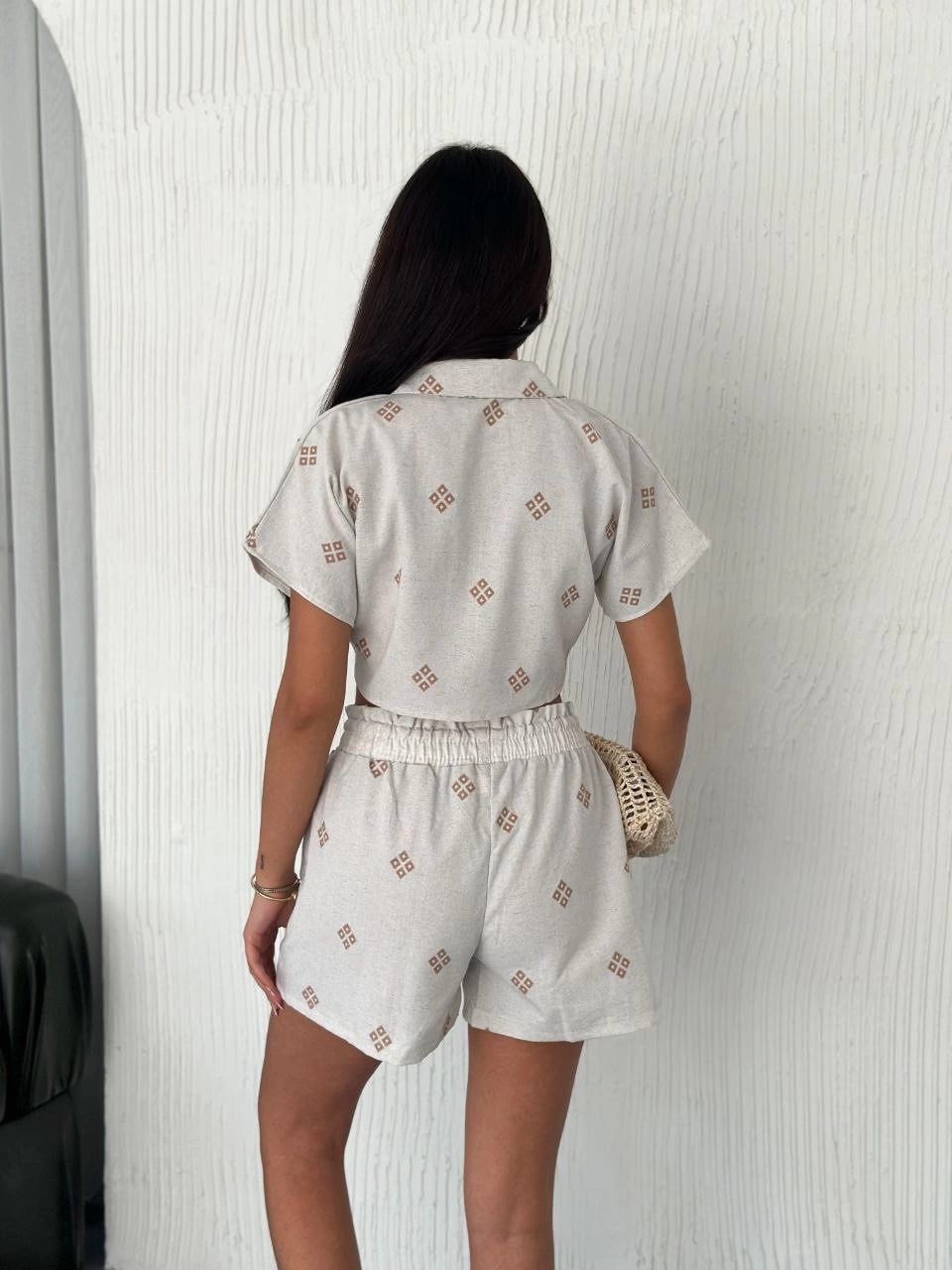 Keten kumaştan üretilen şık bir görünüme sahip gömlek şort takımı ile her zaman şıklığınızı koruyun.