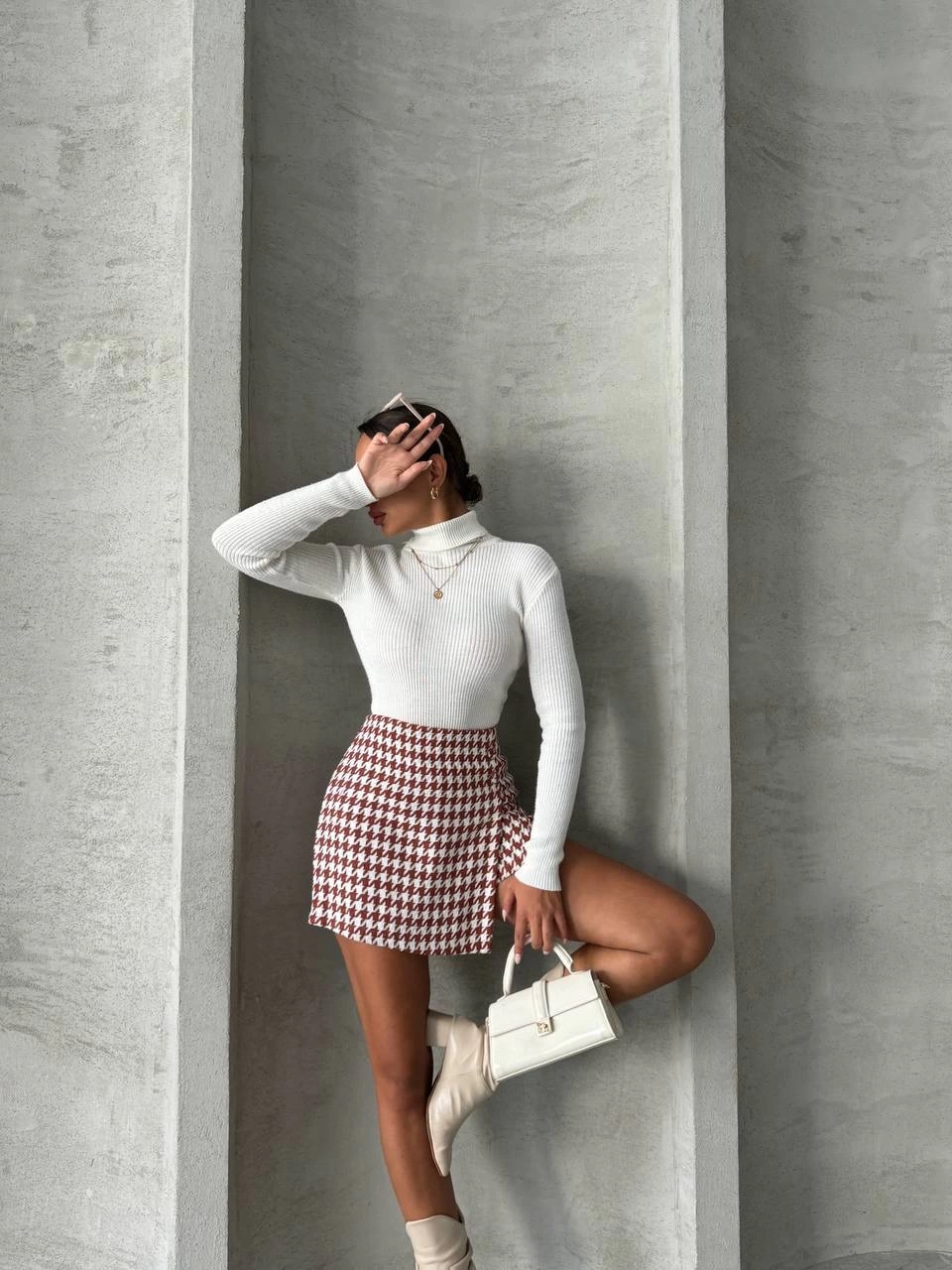 İki düğmeli kaz ayağı desen ch kumaş şort etek bordobeyaz h26414