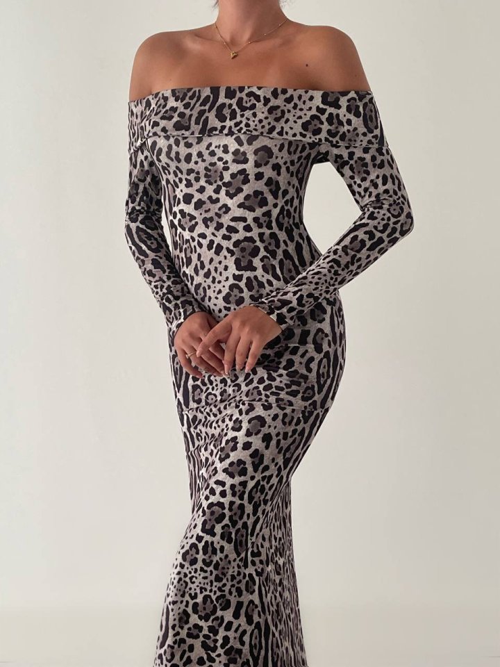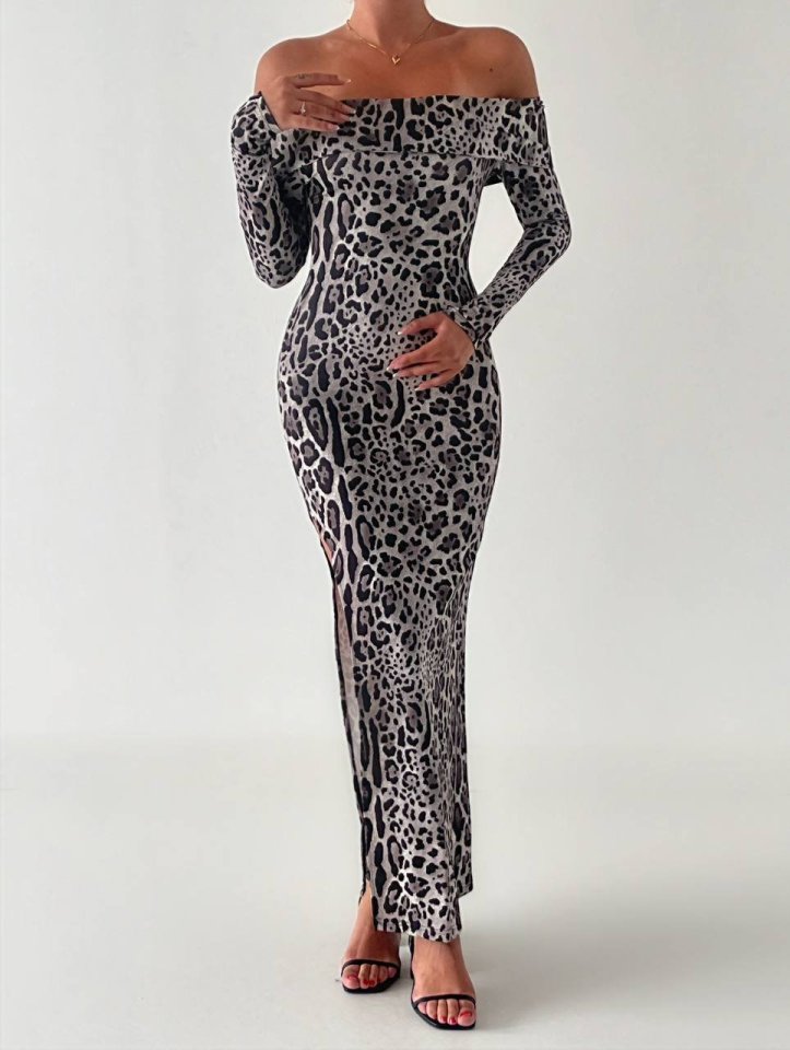 Kadın Madonna Yaka Dalgıç Kumaş Leopar Desen Maxi Boy Derin Yırtmaçlı Elbise