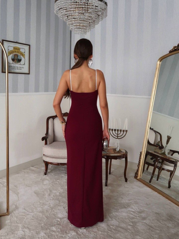 Kadın Omuz Askılı Derin Yırtmaç Detay Maxi Boy Elbise