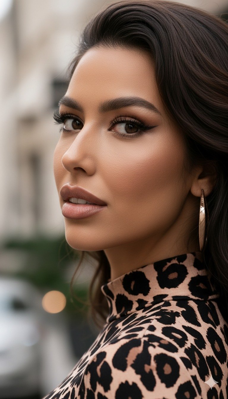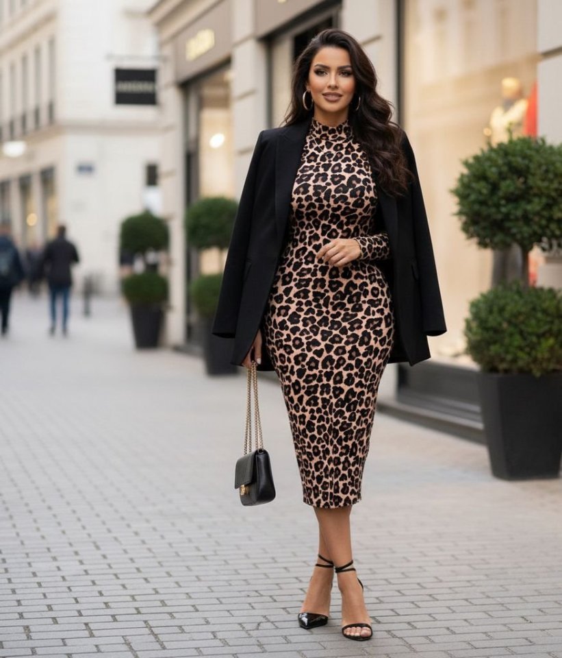 Kadın Uzun Kollu Balıkçı Yaka Leopar Desenli Midi Boy Elbise