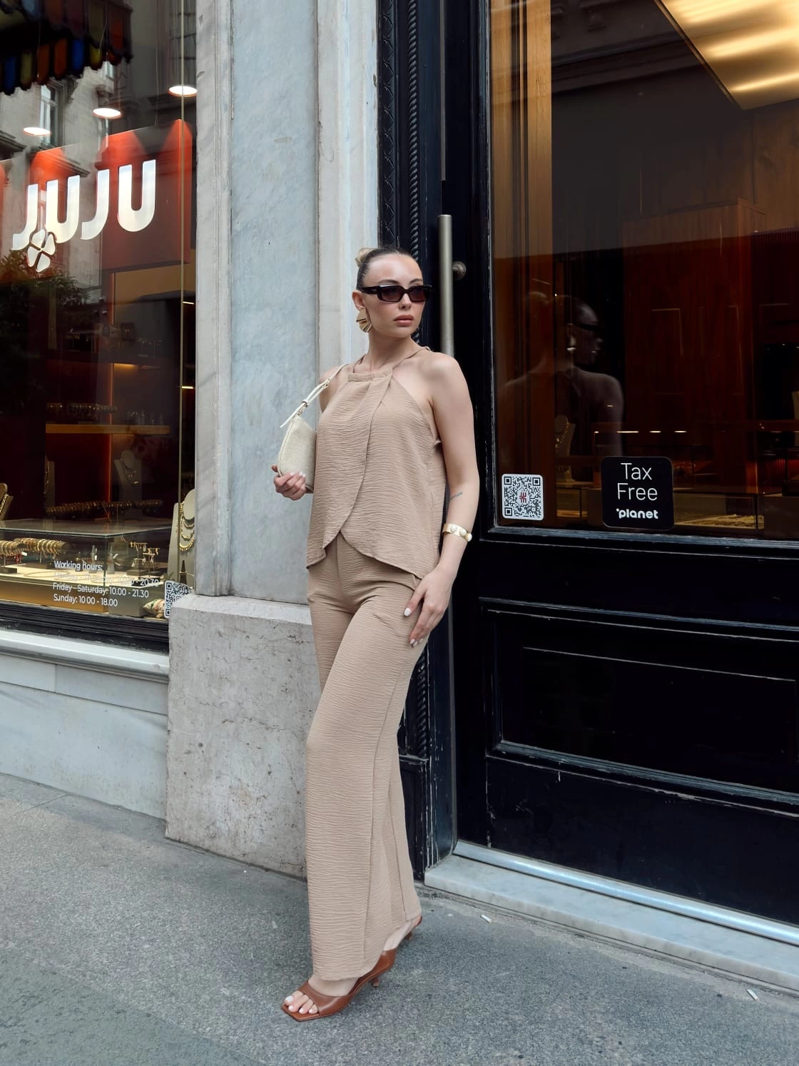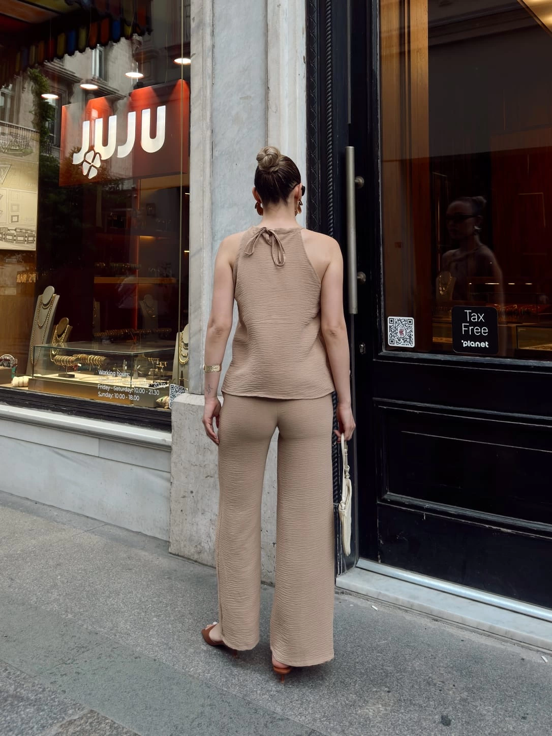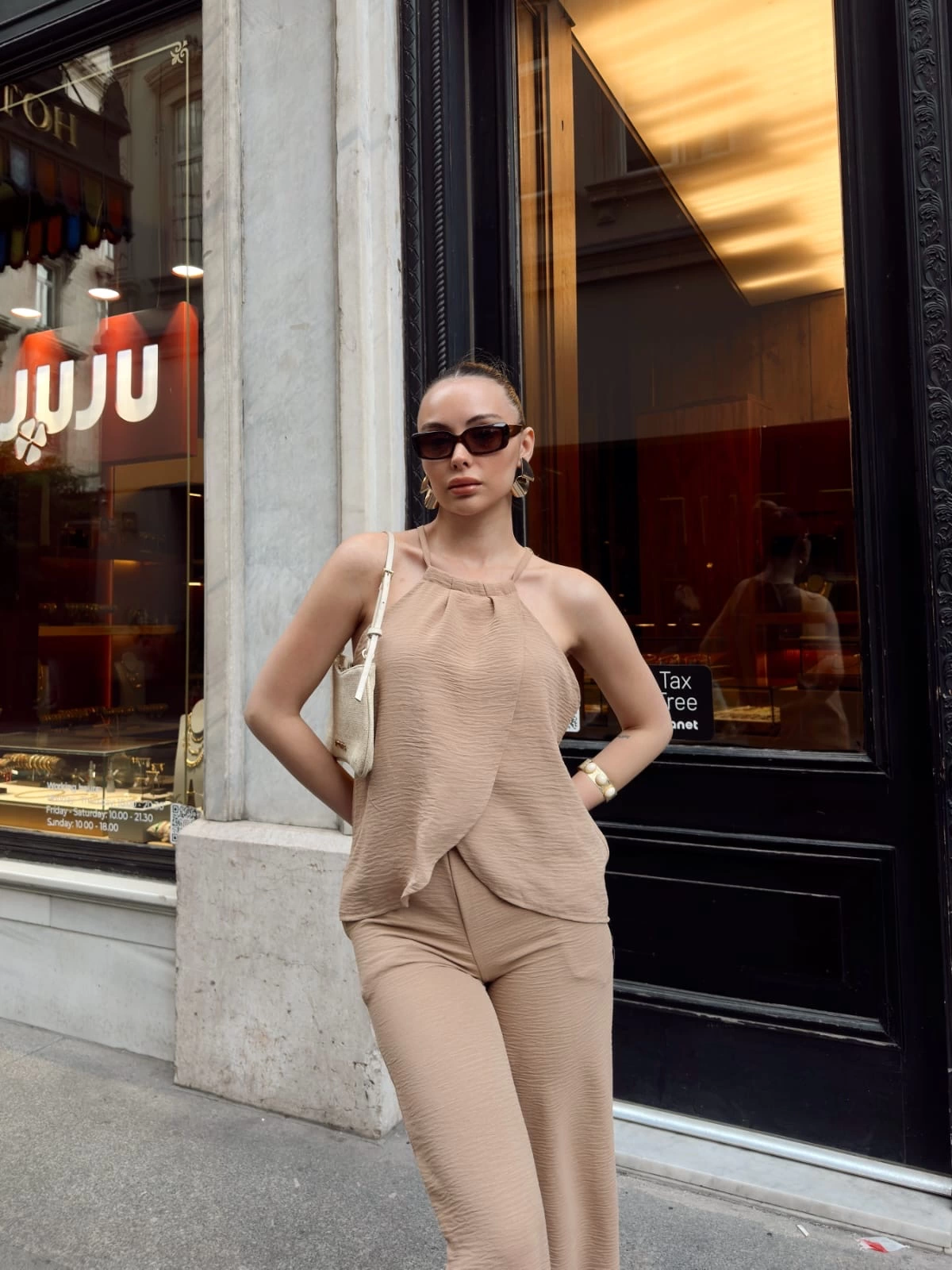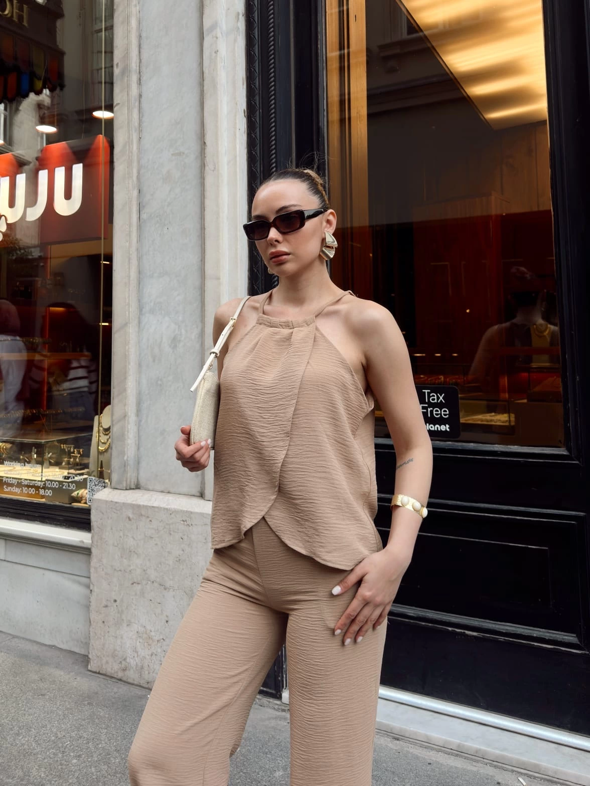 Bej rengiyle her kombinasyona uyum sağlayan s054 model takım, günlük kullanıma ve özel davetlere şıklık katar.