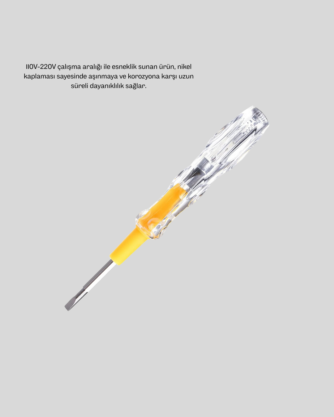 Kalem üzerindeki neon lamba, aktif akımın varlığını kolayca görmenizi sağlar. Bu sayede 110V – 220V arasındaki geniş çalışma aralığında, enerji hattı kontrolü ve elektrik testi işlemleri son derece güvenli ve pratik hale gelir. Özellikle düşük ışıklı ortamlarda bile neon göstergesi sayesinde net görünürlük sağlanır.